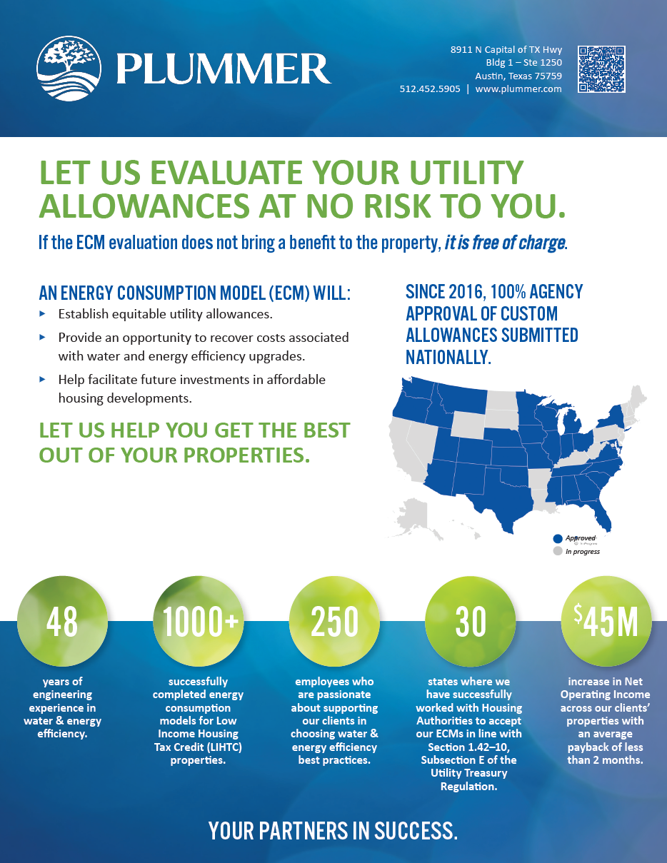 Our team conducts custom utility allowance modeling for multifamily affordable housing developments across the United States. Developers and managers of these properties have the option of providing actual consumption data or conducting energy consumption modeling in lieu of adopting local housing utility allowances. In cases where the actual consumption or the modeled consumption is lower than the published housing utility allowance, the developer or management company can increase its profit and recover money invested in water and energy efficiency upgrades. The cost of conducting a water or energy consumption model can generally be recovered in two months or less. Better yet, if the model we create for you does not make economic sense by being lower the local published housing allowance, or if the model is not approved by the regulating state agency, there is no charge. It’s as simple as that!